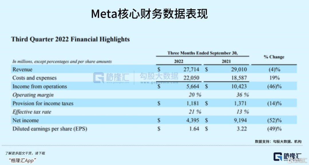 比如,Meta在今年第三季度营收277.14亿美元,同比下降4%,连续第二个季度下滑,而二季度是Meta历史上首次下滑。Q3净利润43.94亿美元,同比大幅下滑52%,已是连续第4个季度下滑。