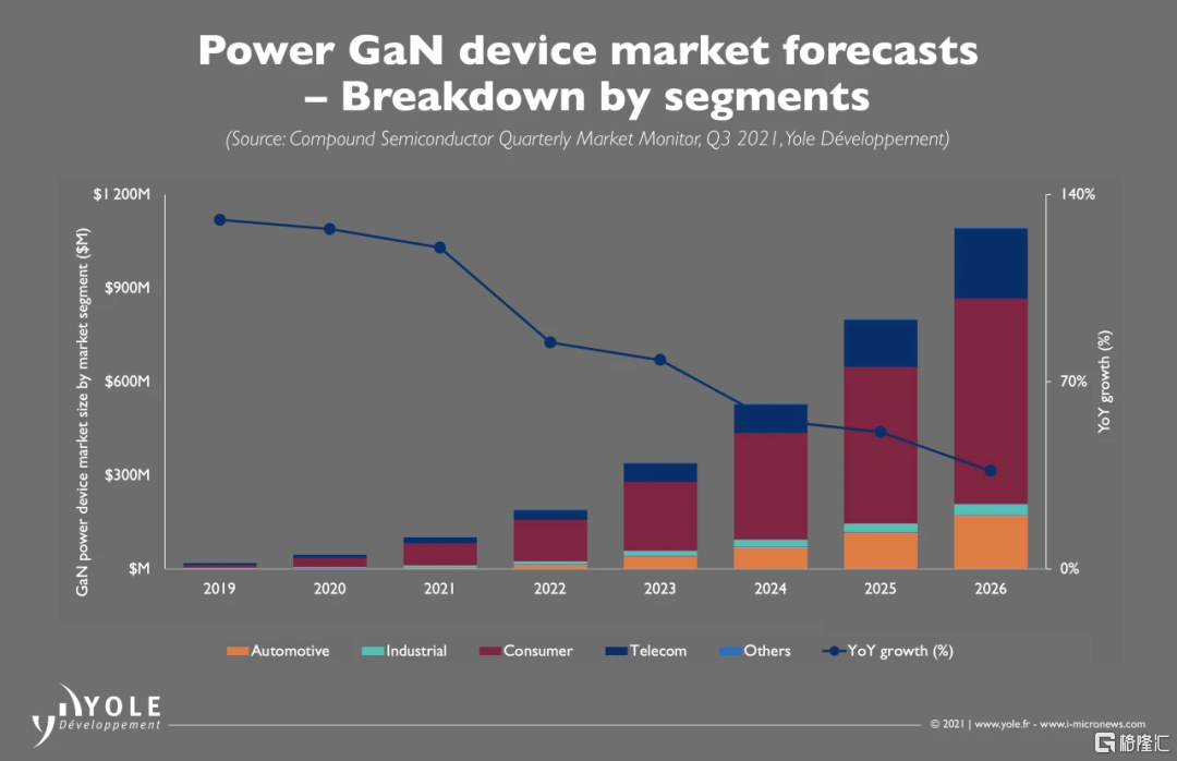 鉴于这一活动,GaN 功率器件的收入在 2021 年达到了约 1 亿美元。但随着 GaN 器件供应商寻求进入其他市场以提高产量,这一数字预计到 2026 年将增至 10 亿美元。EV/HEV市场是第一看点。