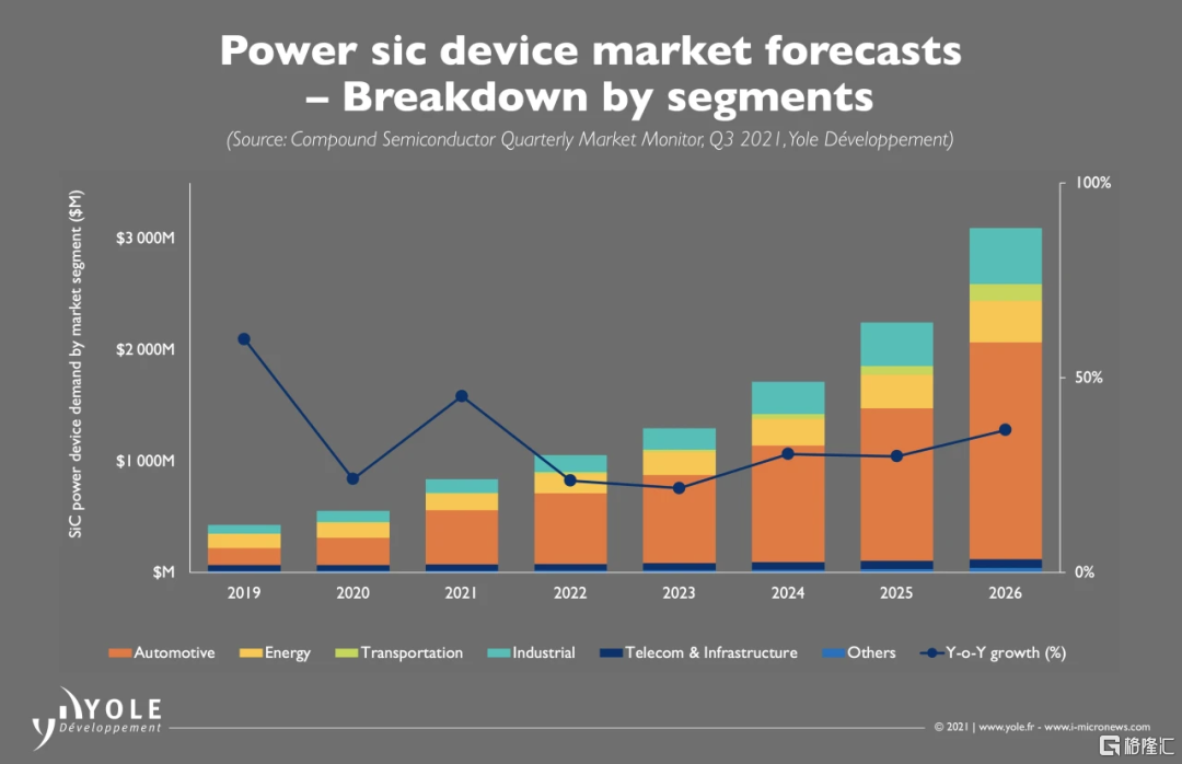 特斯拉于 2017 年启动了 SiC 功率器件市场,当时它成为第一家在其 Model 3 的内部主逆变器设计中添加来自 STMicroelectronics 的 SiC MOSFET 的汽车制造商。其他汽车制造商迅速效仿电动汽车巨头脚步,包括现代、比亚迪、蔚来、通用汽车等。
