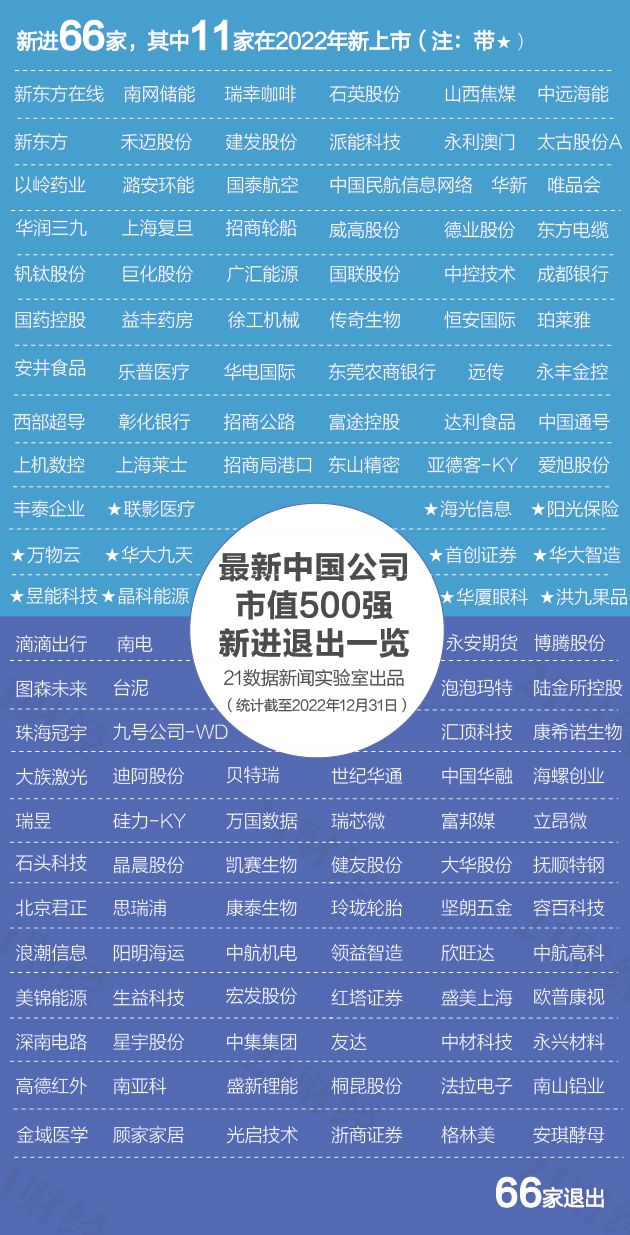 资本市场动荡,中国市值500强公司重新洗牌。21数据新闻实验室推出最新一期中国上市公司市值500强榜单发现,本期有66家公司新进入榜,TOP20座次发生明显变化。
