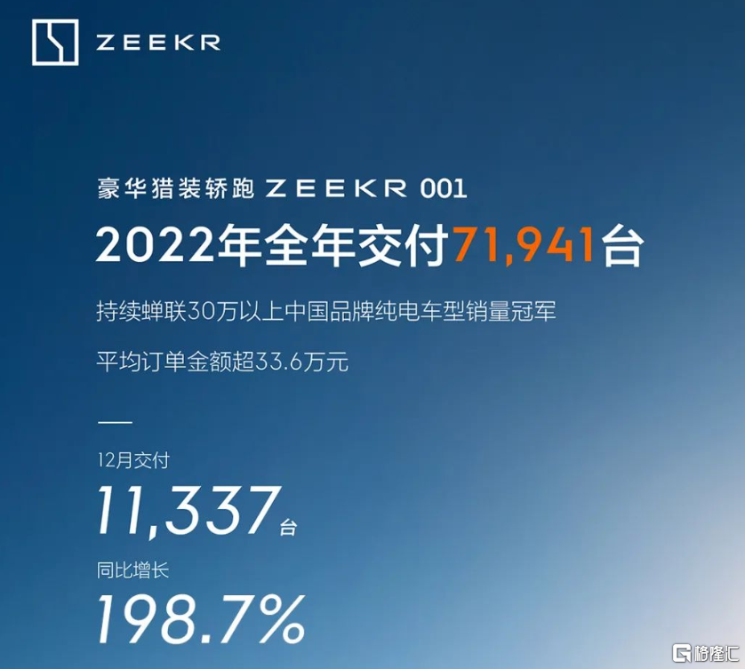 吉利控股集团旗下高端智能电动品牌极氪宣布,12月,极氪001交付量达到11,337辆,同比增长198.7%。