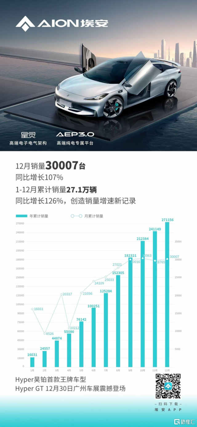 埃安12月销量翻番,预计明年交付50万。最新公布的数据显示,埃安2022年12月销量30007台,同比增长107%。