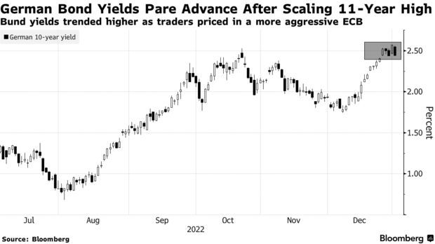 欧洲债券在2023年首个交易日大幅上涨,这一迹象表明,交易员正在利用近期的抛售,在通胀开始降温之前锁定一部分十多年来最高的收益率。数据显示,十年期德国国债收益率下跌14个基点至2.43%,从上周触及的2011年以来的最高水平回落;十年期意大利国债收益率则下跌了16个基点。由于主要市场仍因假日休市,交易量低于正常水平可能加剧了这一走势。