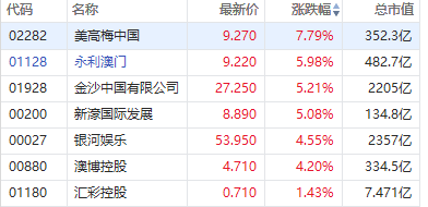 华盛资讯1月3日消息,港股博彩股拉升走高,截至发稿,美高梅中国涨近8%,永利澳门、金沙中国有限公司、新濠国际发展涨超5%,银河娱乐、澳博控股涨超4% 。