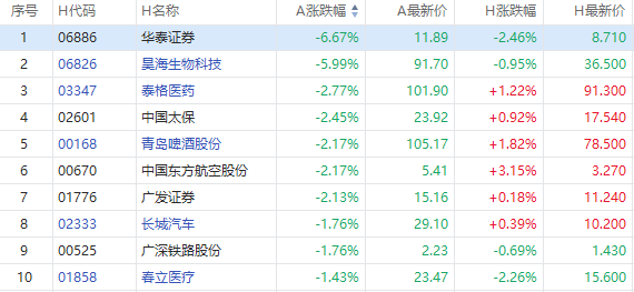 截至A股收盘,AH股跌幅前10如下: