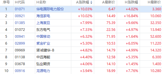 截至A股收盘,AH股涨幅前10如下: