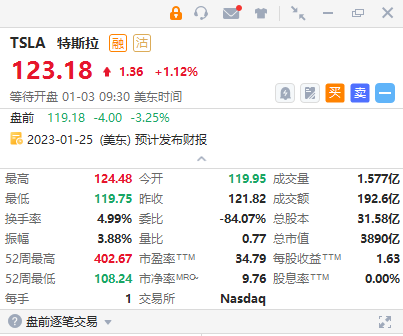 特斯拉盘前跌超3%,2022年第四季度交付量达40.53万辆,仍不及市场预期的42.08万辆。