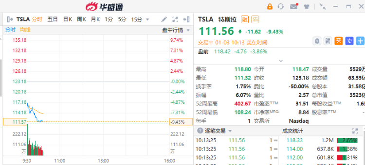 华盛资讯1月3日消息,美股三大股指悉数转跌,截止北京时间23:11,纳斯达克指数跌0.42%,标普500指数跌0.29%,道琼斯指数跌0.18%;特斯拉大跌9.43%,报111.56美元,逼近上月末创下的2020年9月以来新低。