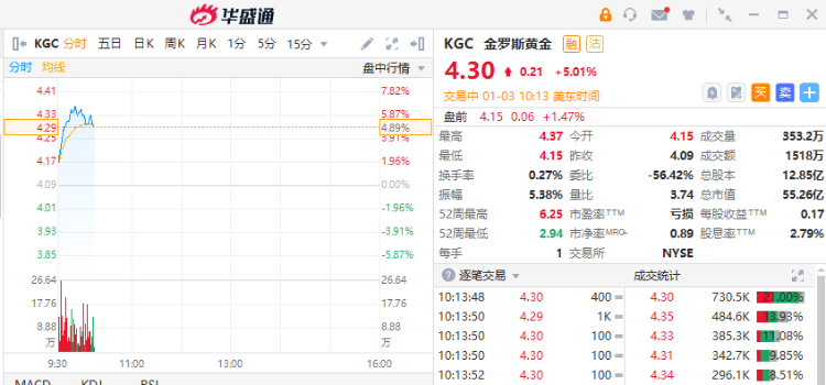 美股黄金板块走高,金罗斯黄金、哈莫尼黄金涨超5%,金田涨4.93%,赫克拉矿业、埃氏金业涨超4%。