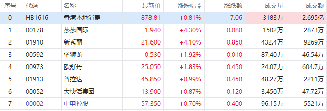 1月4日讯,香港零售股走势强劲,六福集团(00590)涨7.48%,新秀丽(01910)涨4.10%,莎莎国际(00178)涨4.3%,周生生(00116)涨3.6%,欧舒丹(00973)涨1.83%,周大福(01929)涨1.82%。