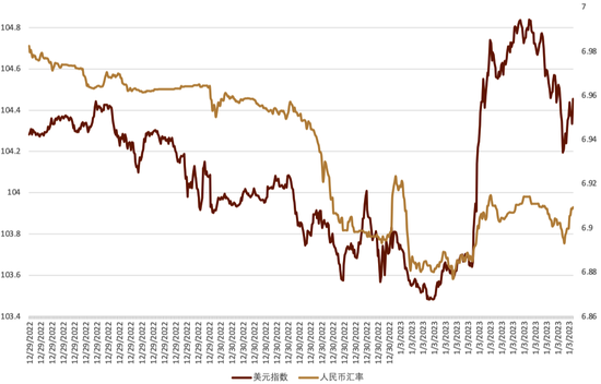 人民币汇率收复6.90 在2022年的最后一个交易日,在岸人民币在16:30分官方收盘后便在流动性相对偏弱的夜盘开启了一波升值行情,在当晚11点30夜盘收盘前,人民币汇率便升破了6.90 (图表1),这是在岸人民币汇率自2022年9月初以来首次收复6.90关口。在2023年的第一个交易日,人民币汇率在开盘不久之后再度拉升至6.90下方,此后尽管冲高回落,但在美元指数反弹的背景下,人民币汇率的回落幅度有限。近5个交易日,美元指数总体上有所回升,但人民币却逆势升值500点,短期的势头较为强劲。