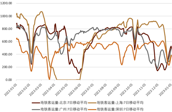 从具体数据上看,百度搜索指数中“发烧”的热度在12月中下旬达峰后已经回落到12月初的水平,这表明从全国的维度看,疫情的相关扰动正在快速减弱。从我们跟踪的数据看,主要城市的地铁客运量都从今年四季度的低点开始快速反弹。其中,北京、广州和深圳的客运量在1月2日已经恢复到了正常水平的一半以上(图表2)。国家邮政局跟踪的数据显示,今年元旦假期,全国快递业揽收和投递快递的数量均较2022年同期增长10%以上。经济活动的快速恢复给予了中国资产乃至人民币汇率更多溢价。这与此前中国将新冠感染乙类乙管和与中国香港更快实现通关的消息一道,成为了人民币汇率得以在一篮子货币中走势领先的重要支撑。