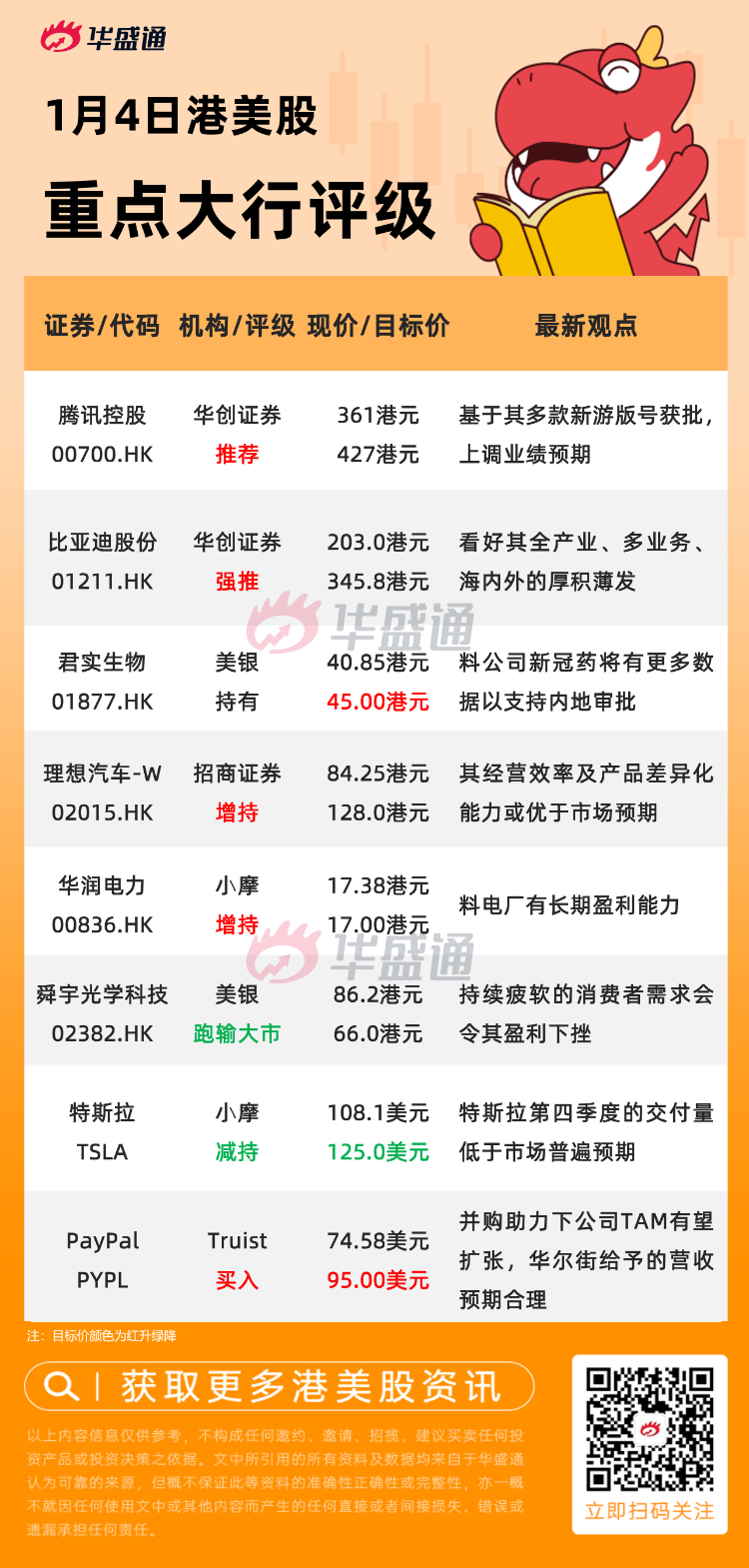 编者按:招商证券称理想经营效率及差异化能力优于预期,目标价128港元;华创看好腾讯再涨18%,上调其业绩预期;富瑞:料君实生物新冠药将有更多数据支持内地审批,评级“持有”>>
