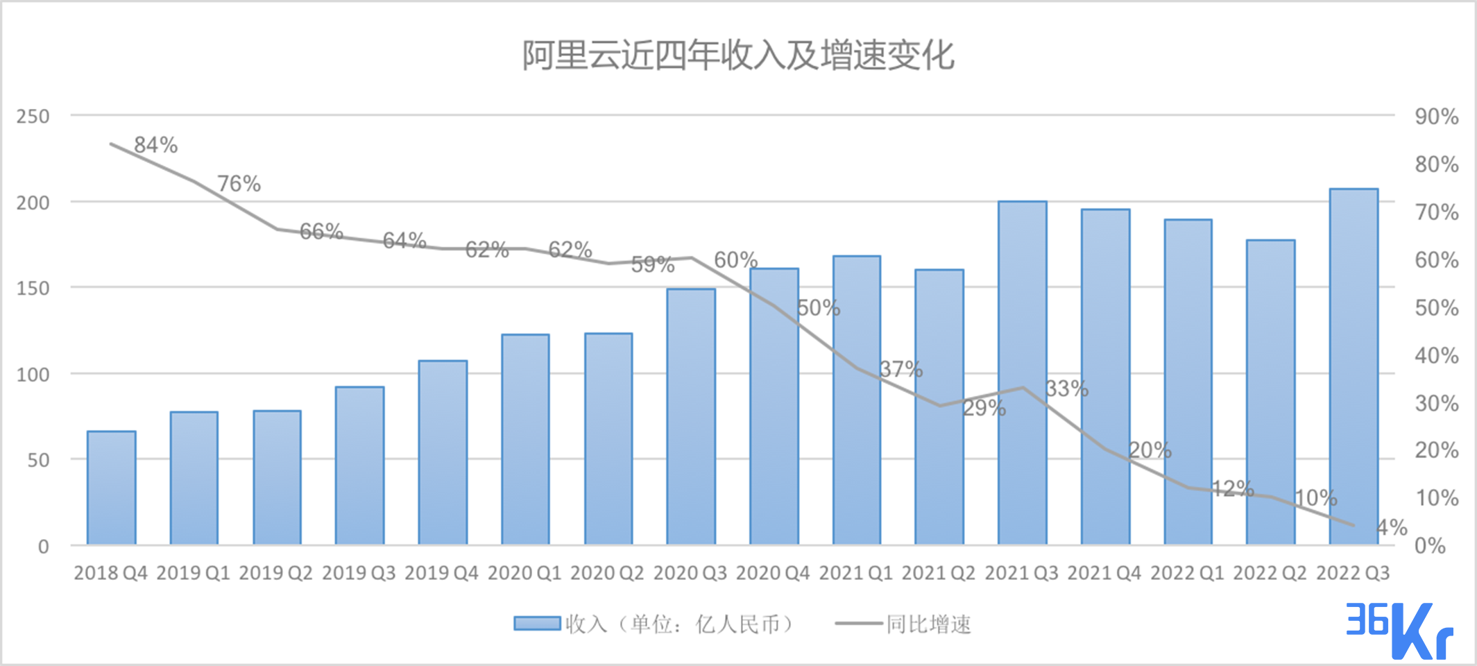 由于新市场开拓不力,最近几年,阿里云增速从2018年的超过80%,此后一路跌至最新季度的不足4%,创历史最低点。