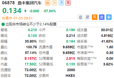 鼎丰集团汽车复牌低开低走,目前跌幅扩大至37%,暂成交4.92亿港元,鼎丰集团汽车在2023年首个交易日大跌超85%后临时停牌。