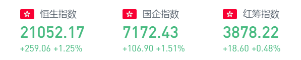 截至周四收盘,恒生指数涨1.25%,报21052.17点,国企指数涨1.51%,红筹指数涨0.48%。恒生科技指数涨1.51%,汽车股涨幅居前,小鹏汽车-W涨近7%,蔚来-SW、理想汽车-W涨近6%。科技股多数上涨,美团-W涨约5%,阿里巴巴-SW涨约3%,京东集团-SW涨近3%。