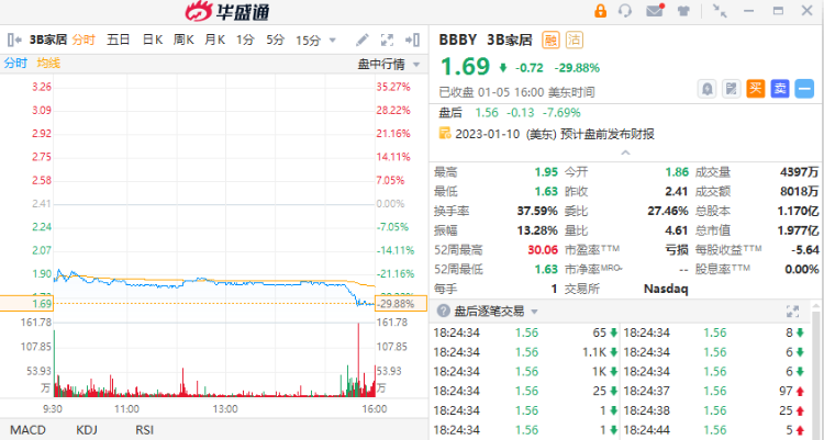 截至收盘,3B家居盘中下跌29.88%至1.69美元,该公司以第三财季销售差于预期为由,发布了“持续经营的能力存在重大疑问”警告,称在未来几个月内,可能没有现金来支付租赁协议或向供应商付款等费用。