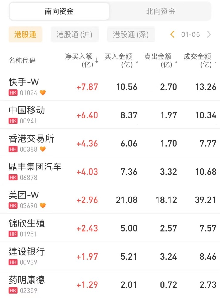南下资金净买入快手-W7.87亿港元,净买入中国移动6.40亿港元。此外,香港交易所、鼎丰集团汽车分别获净买入4.36亿港元、4.03亿港元。