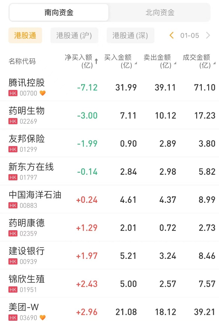 南下资金净卖出腾讯控股7.12亿港元,为今日卖出之最;药明生物遭净卖出3亿港元;友邦保险、新东方在线也遭抛售。