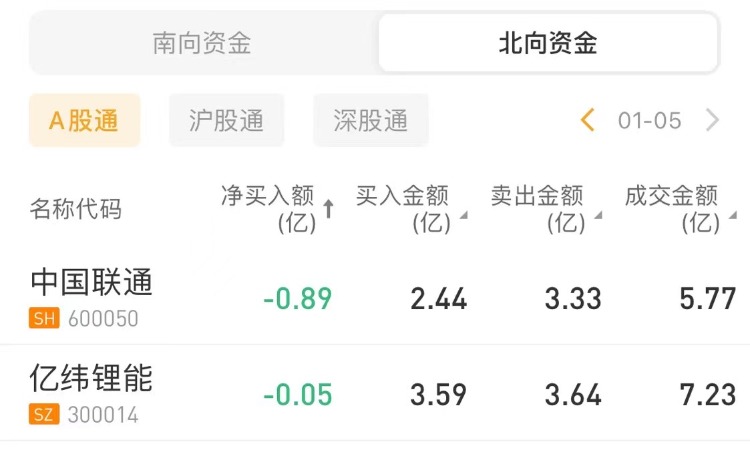今日北上资金净卖出中国联通0.89亿元,净卖出亿纬锂能0.05亿元。