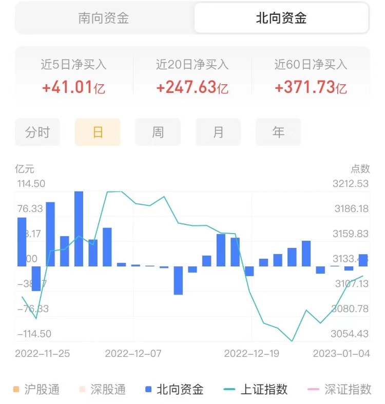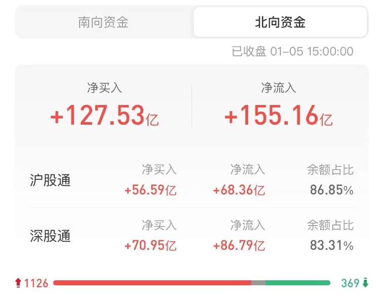 北上资金今日净买入127.53亿元,沪股通净买入56.59亿元,深股通净买入70.95亿元。上一交易日净买入18.44亿元。