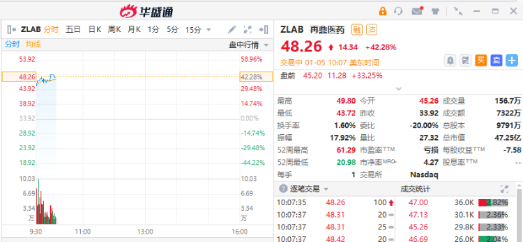 再鼎医药涨42.28%,报48.26美元,公司旗下擎乐和纽再乐两款产品首度参与谈判,机构指,若进入医保目录,23年料进一步放量。