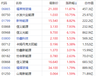 华盛资讯1月6日消息,港股光伏太阳能板块早盘走高,截至发稿,福莱特玻璃涨近12%,新特能源涨近9%,协鑫科技涨超5%,协鑫新能源涨超3%,信义玻璃、福耀玻璃涨超1%。