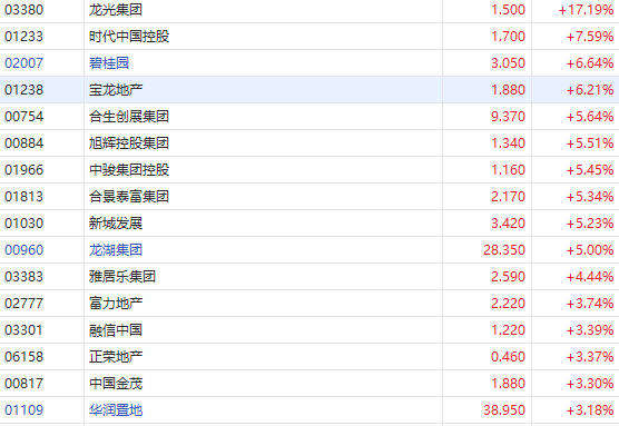 1月6日,房地产板块活跃,港股方面,内房股集体走强,龙光集团涨超17%,时代中国控股涨超7%,宝龙地产涨超6%,旭辉控股集团、新城发展、龙湖集团涨超5%,富力地产、华润置地等集体跟随走强。