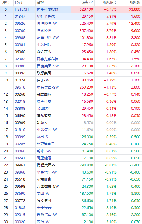其他成分股方面,华虹半导体涨超5%,舜宇光学科技涨超1%;商汤跌超3%,平安好医生跌超2%。