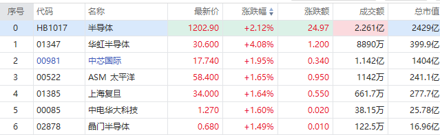 华盛资讯1月10日消息,港股半导体板块盘中快速拉升,截至发稿,华虹半导体涨4.08%,报30.6港元每股,成交额0.89亿港元;中芯国际涨1.95%,报17.74港元每股;ASM太平洋、上海复旦、晶门半导体等跟涨超1%。