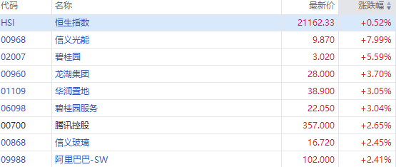 今日早盘,港股恒指窄幅震荡,截至午盘,恒指涨0.52%,报21162.33点,信义光能大涨8%,领涨蓝筹。大型科技股继续上涨,哔哩哔哩涨5%,阿里巴巴、腾讯涨2%,京东、百度涨1%。