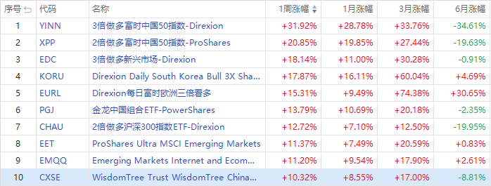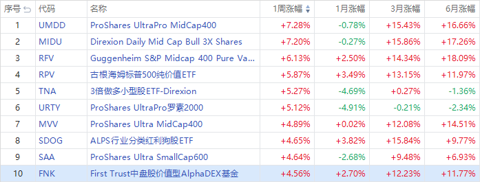 股指ETF方面,本周涨幅居前的是ProShares 3倍做多中型股 $UMDD ,全周收涨超7%。位居第二位的同样是3倍做多中型股ETF $MIDU ,周涨幅达7.2%。此外,小型股ETF $TNA 和罗素2000 ETF $URTY 亦上榜前十。