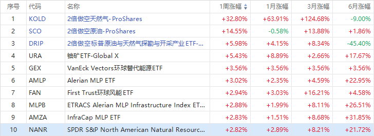 能源ETF方面,做空类ETF多数涨幅居前。位居首位的是做空天然气ETF $KOLD ,周涨幅达32.8%。另有两只做空原油类ETF上榜前三,2倍做空原油ETF $SCO 周涨14.55%,2倍做空标普原油与天然气勘探开采ETF $DRIP 涨近6%。