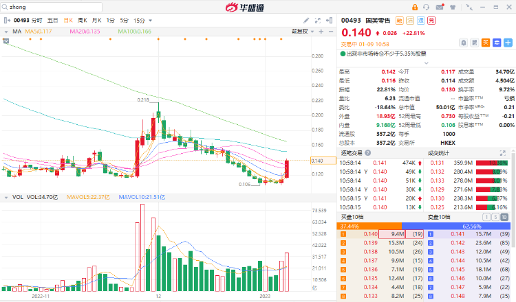 华盛资讯1月9日消息,国美零售盘初显著冲高,升近23%。近两月,北水大举加仓国美零售,持股占比由30%增至51.87%。目前,公司已获控股股东累计提供7.8亿港元无息贷款,以用作集团一般营运资金。截至发稿,国美零售涨22.81%,报0.14港元,成交额4.5亿港元。