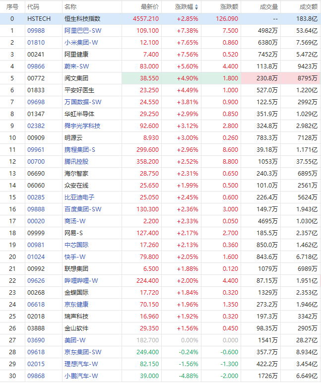 科网股集体走强,小米集团-W、阿里巴巴-SW、阿里健康涨超7%,阅文集团涨超4%,腾讯控股、网易-S、百度集团-SW涨超2%。