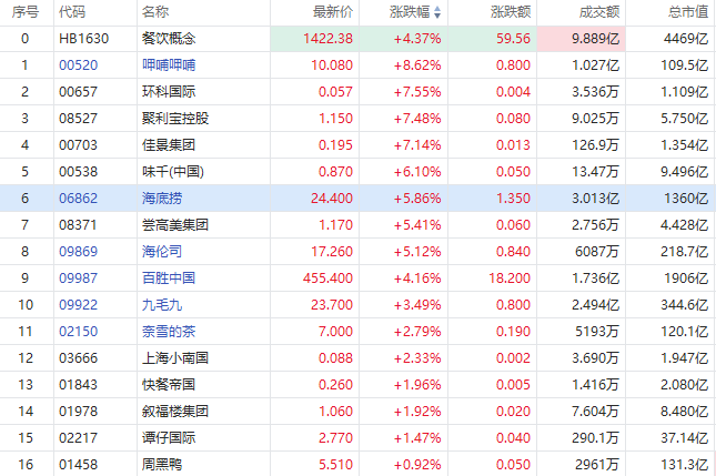 华盛资讯1月9日消息,港股餐饮股走势强劲。截至发稿,呷哺呷哺涨8.62%,现报10.08港元每股,成交额1.02亿港元;海底捞涨5.86%,特海国际涨5.9%,海伦司涨5.12%,百胜中国涨4.16%,九毛九涨3.49%,奈雪的茶跟涨。