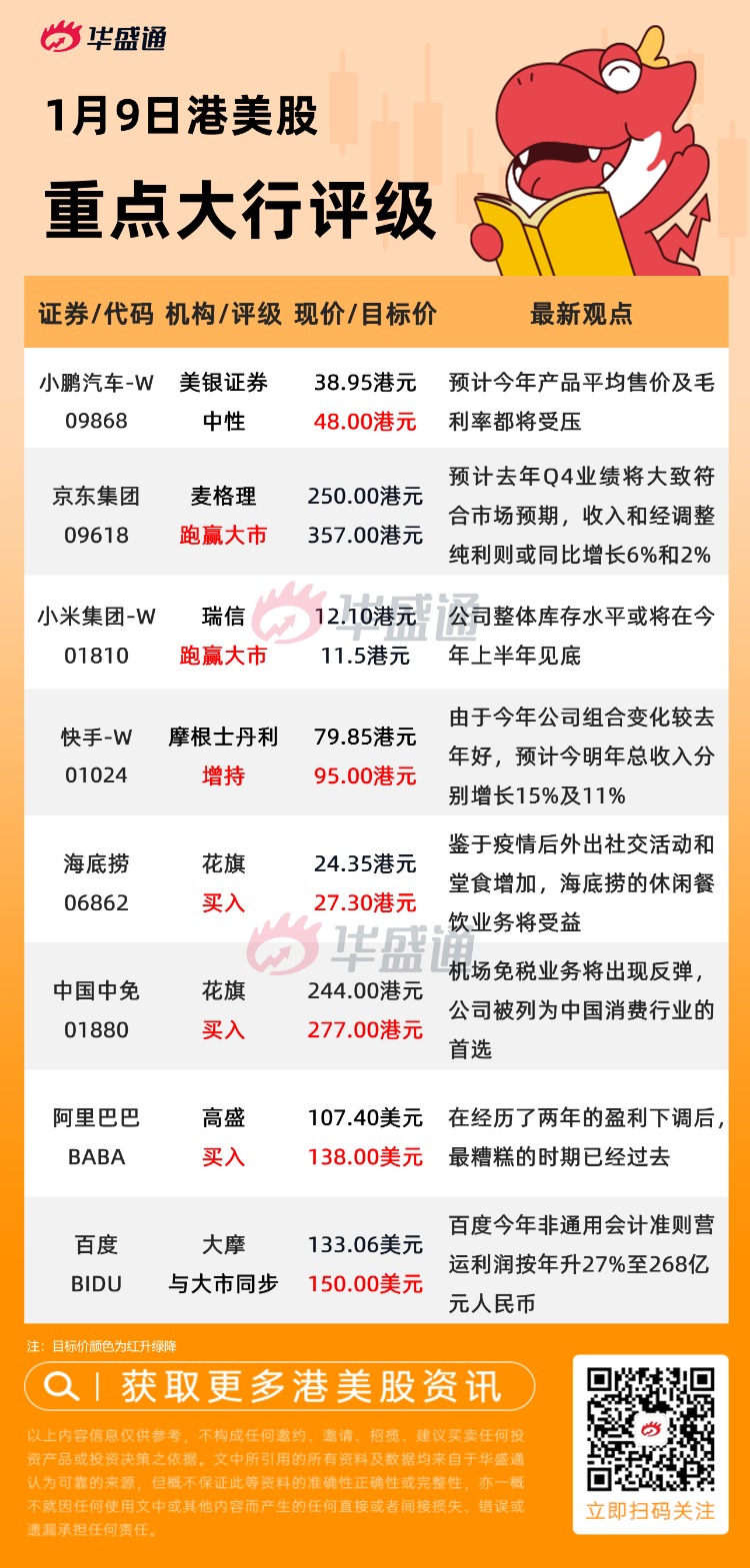 大摩发布研究报告称,重申快手-W“增持”评级,即使去年10月底起该股股价累升逾140%,跑赢同期科指的逾55%升幅,考虑上调今明两年广告收入增长预测至分别20%及16%,带动毛利率及净利润率预测上调,目标价由60港元上调58%至95港元。