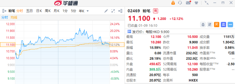 华盛资讯1月9日讯,职业教育平台粉笔高开6.06%,盘中走高收涨12.12%,一手账面浮盈600港元,全日成交额1.304亿港元,最新总市值232.8亿港元。