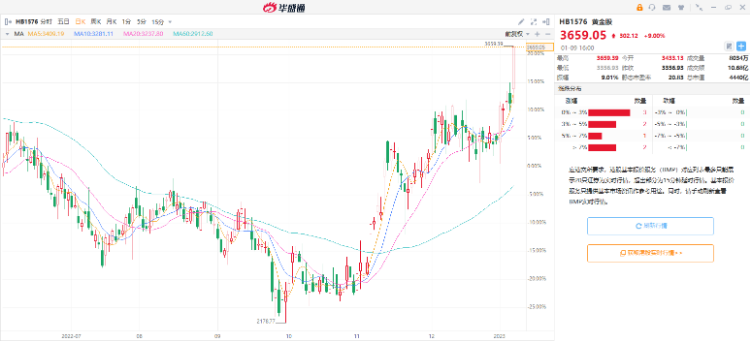 昨天(2022年1月9日),黄金股普遍收涨,截至收盘,紫金矿业涨10.23%,招金矿业、山东黄金、中国黄金国际均大幅收涨。黄金行情也带动贵金属板块跟涨,中国白银集团收涨4.82%。