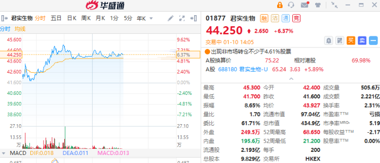 1月10日讯,君实生物股价今日拉升大涨,一度涨超8%,截至发稿涨6.37%,现报价44.25港元,当前成交额2.221亿港元。