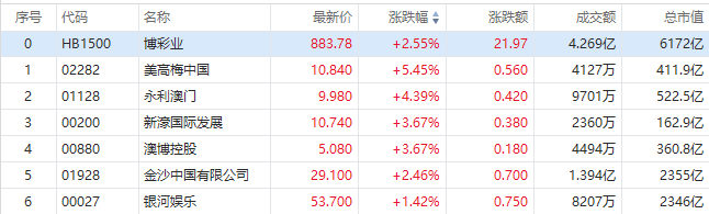 华盛资讯1月10日消息,港股博彩股集体拉升。截至发稿美高梅中国涨5.45%,报10.84港元每股;永利澳门涨4.39%,新濠国际发展、澳博控股涨超3%;金沙中国涨2.46%,报29.1港元每股,成交额1.39亿港元,银河娱乐跟涨。