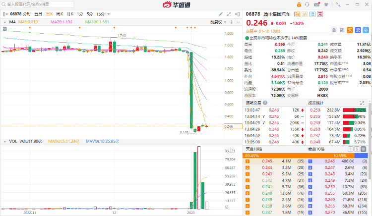 不过到了1月6日,公司股价高开高走,盘中一度涨近60%,截止收盘其股价大涨55.84%,公司成交额更是高达21.45亿港元,创下公司上市以来新高水平。1月9日,鼎丰集团汽车股价延续升势,再度高开,盘中一度涨超15%,随后,公司涨幅收窄,最终收报0.242港元,微涨0.83%,市值回升至17.44亿港元。