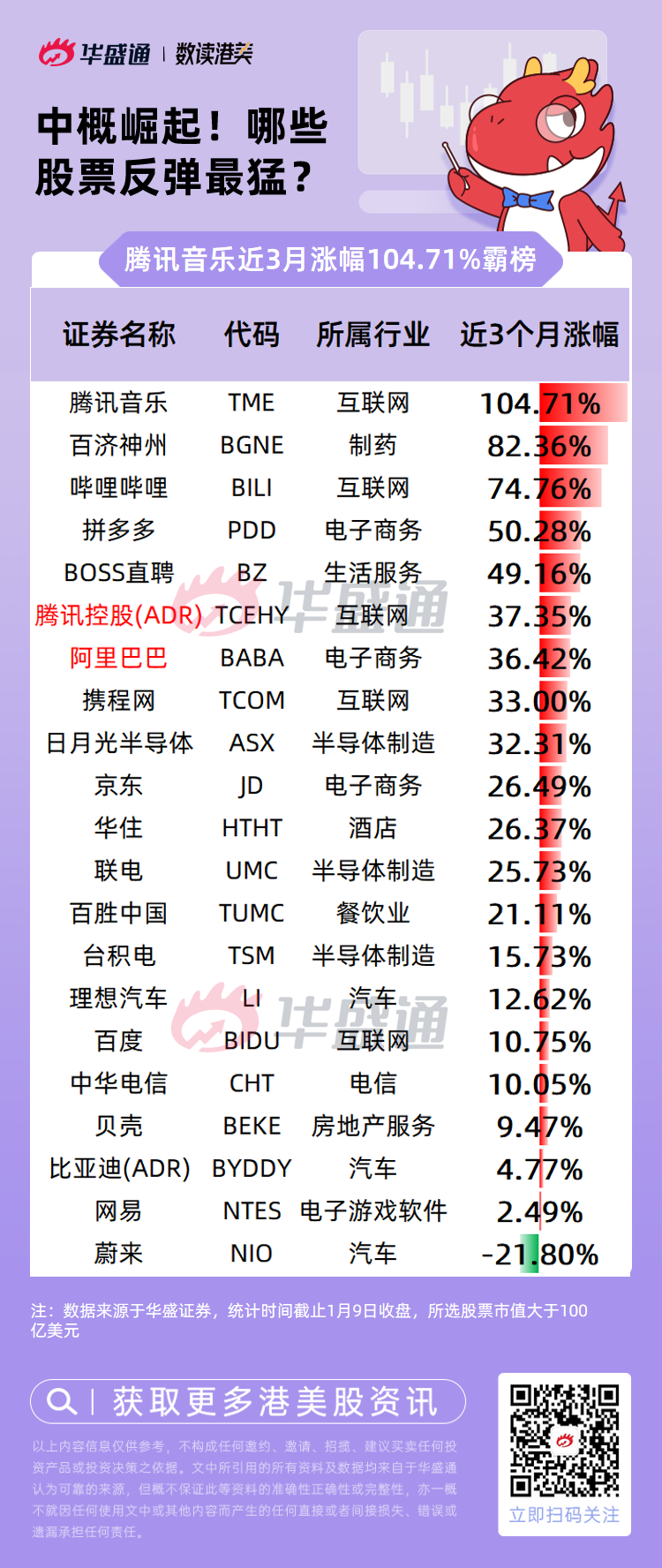 一、中概大爆发!腾讯音乐最近3个月涨幅104.71%霸榜