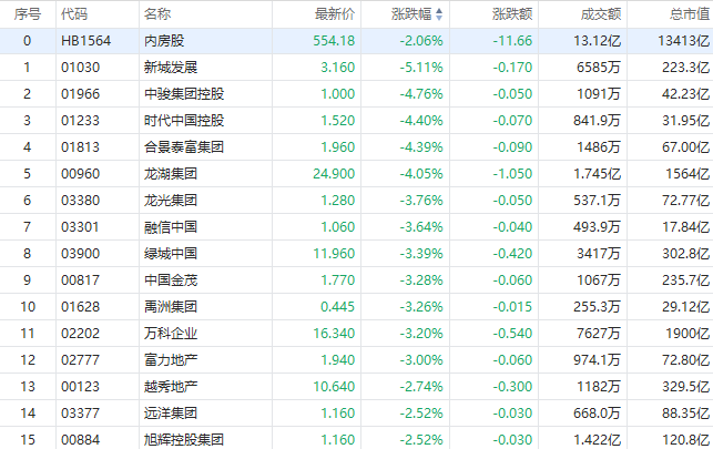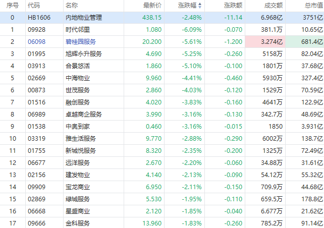 物管股方面,碧桂园服务跌5.61%,报20.2港元每股,成交额3.27亿港元;旭辉永升服务跌超5%,世茂服务跌逾4%,新城悦服务、融创服务跟跌。