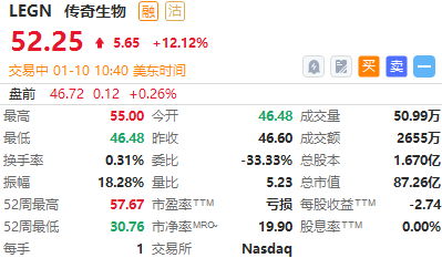 传奇生物涨超12%,现报52.25美元,此前宣布收到纳斯达克发出的未合规通知。