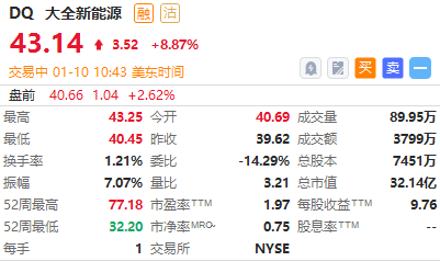 大全新能源涨超8%,现报43.14美元,此前发布公告,公司财务总监兼副总经理冯杰申请辞职。