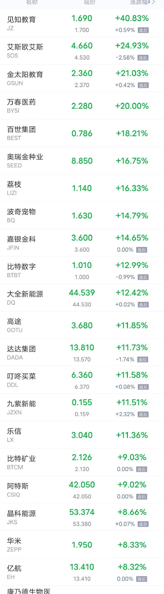 见知教育涨超40%,艾斯欧艾斯涨超24%,金太阳教育涨超21%,万春医药涨超20%,百世集团涨超18%,奥瑞金种业、荔枝涨超16%,波奇宠物、嘉银金科涨超14%,比特数字、大全新能源涨超12%,高途、达达集团、叮咚买菜、九紫新能、乐信涨超11%,比特矿业、阿特斯涨超9%,晶科能源、华米、亿航、康乃德生物医药涨超8%,第九城市、趣头条、人人公司、复朗集团涨超7%。