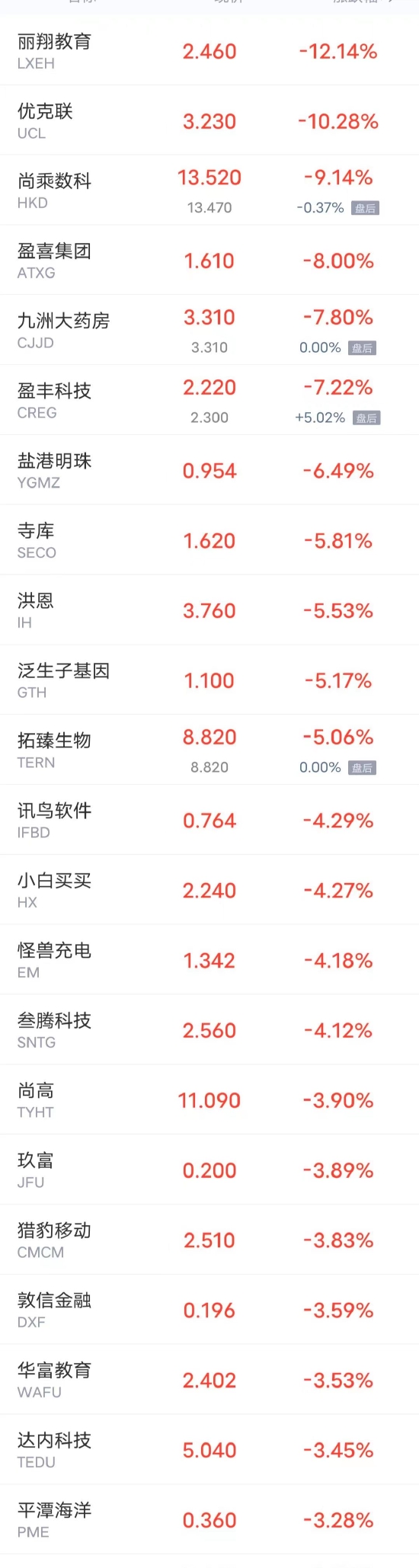 丽翔教育跌超12%,优克联跌超10%,尚乘数科跌超9%,盈喜集团跌超8%,九洲大药房、盈丰科技跌超7%,盐港明珠跌超6%,寺库、洪恩、泛生子基因、拓臻生物跌超5%,中国绿色农业、讯鸟软件、小白买买、怪兽充电、叁腾科技跌超4%。