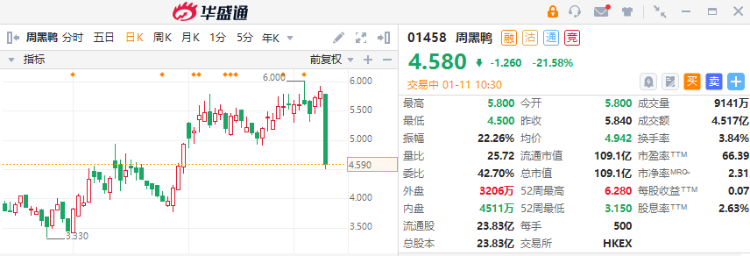 1月11日讯,港股周黑鸭低开0.59%,随后技术走低,股价现跌21.58%,报4.58港元每股,当前成交额超4.51亿港元。