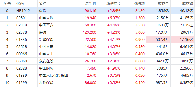 华盛资讯1月11日消息,港股保险股午后持续走高,截至发稿,中国太保涨6.97%,中国平安涨4.49%,报59.30港元每股,成交额21.35亿港元;中国人寿涨4.07%,中国太平涨逾3%,友邦保险、众安在线集体跟涨。